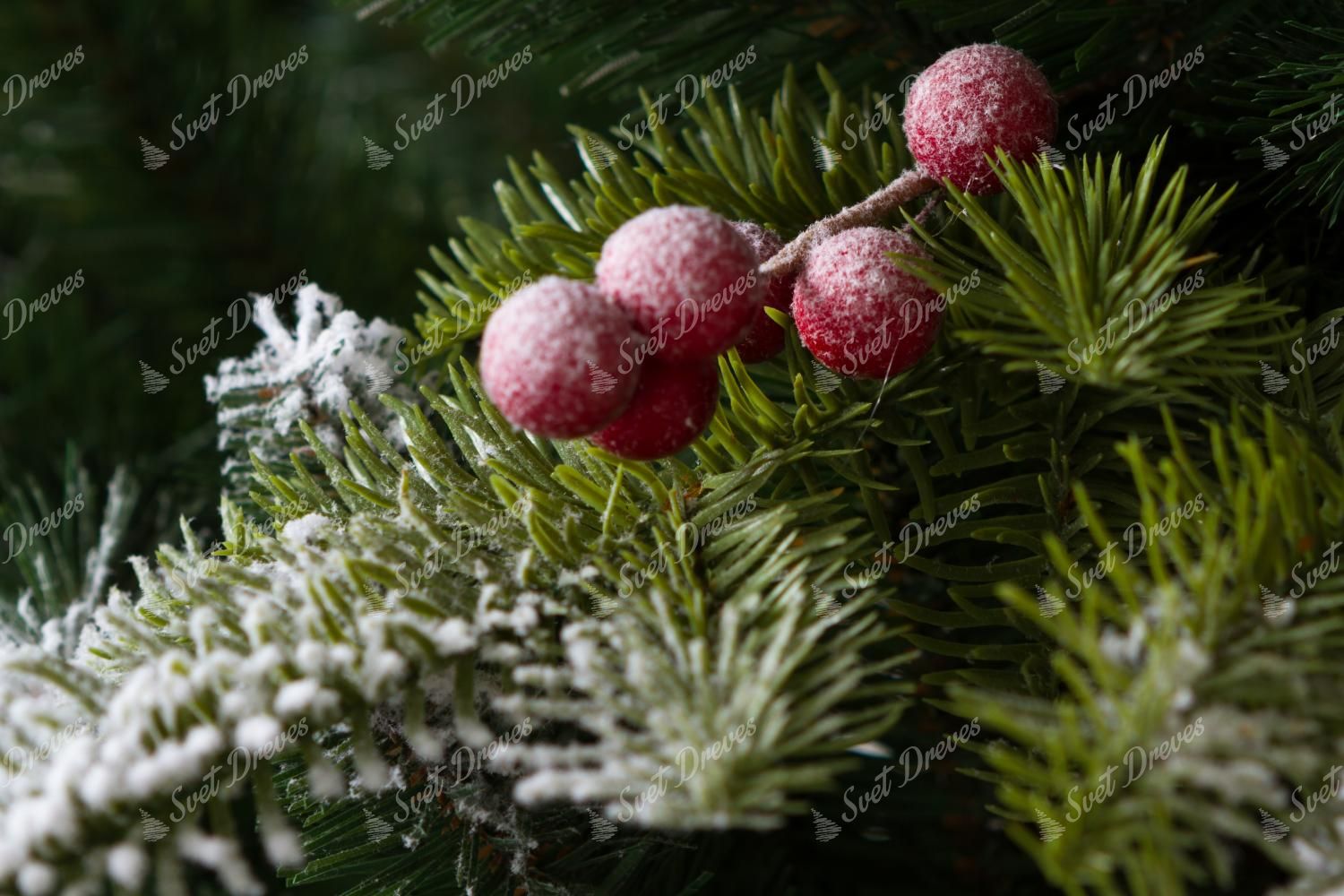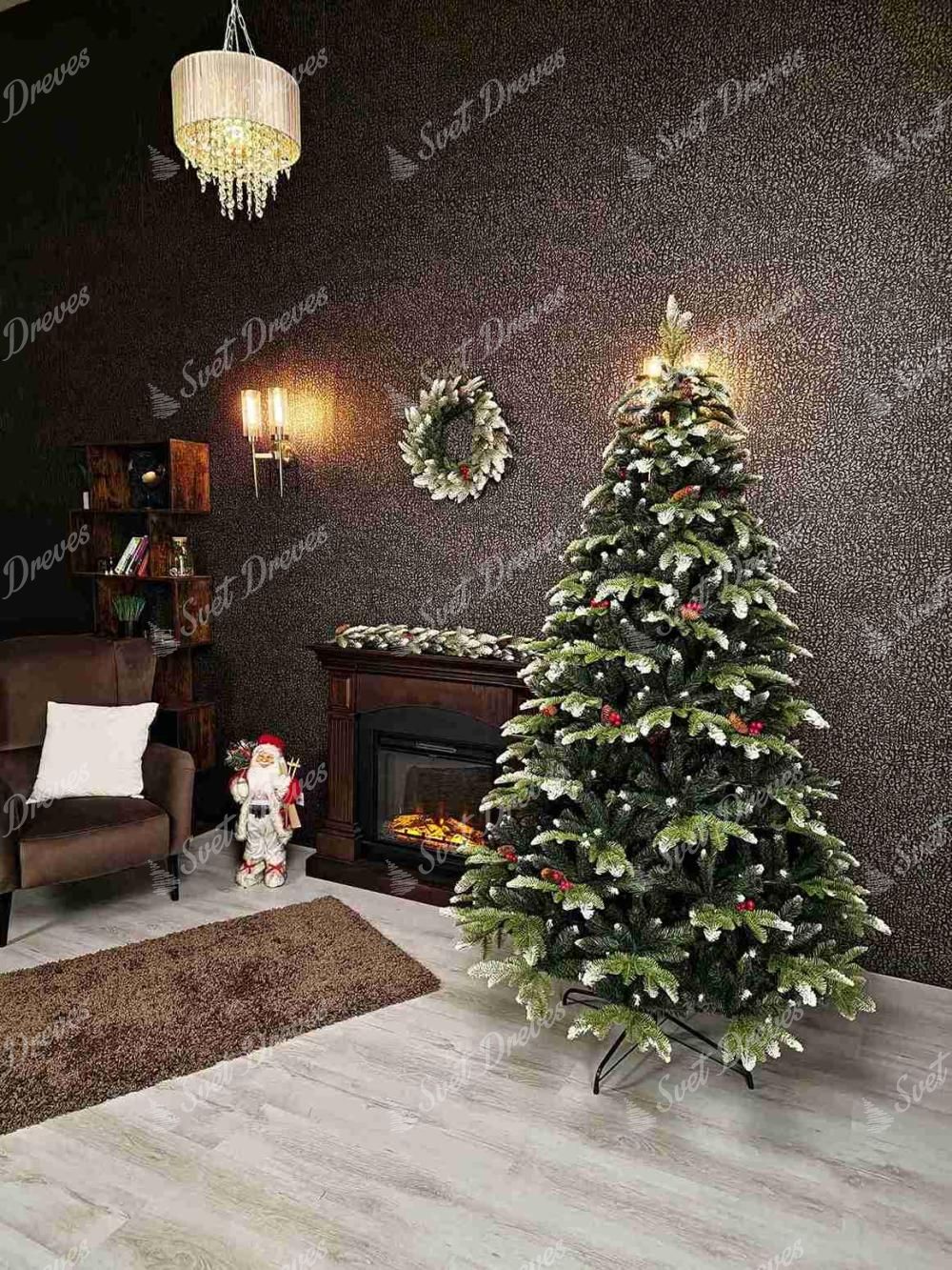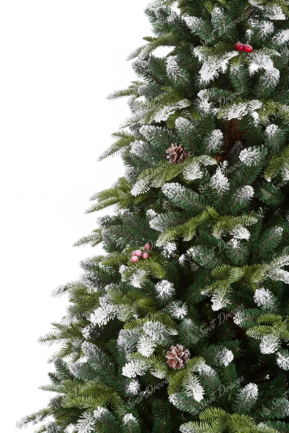 Umetno božično drevo 3D Zasnežena jelka zanjo so značilne gosto zasnežene vejice ob robovih celotnega drevesa. 3D igličje dopolnjujejo zasneženi storži in gozdni sadeži, zaradi katerih ima drevo čudovit tradicionalni videz.
